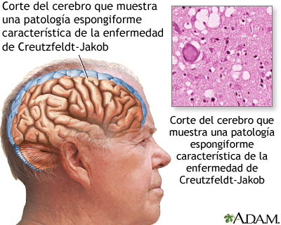 Los síntomas de esta enfermedad están motivados por la acumulación del prión en las células neuronales, originando la muerte celular. Un análisis microscópico revela lesiones como vacuolas que dan al tejido nervioso un aspecto de esponja.